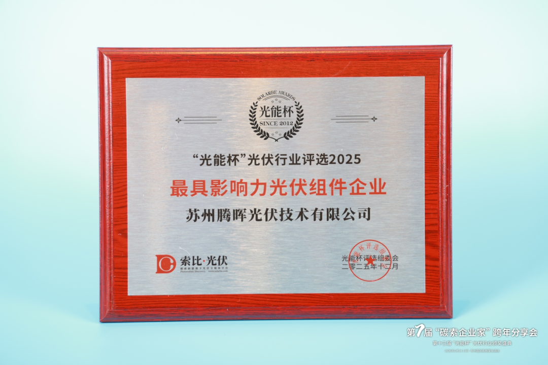 2025年1月15日,由索比光伏主辦的第十三屆“光能杯”光伏行業(yè)評選頒獎典禮在蘇州隆重舉行。蘇州騰暉光伏技術(shù)有限公司憑借持續(xù)領(lǐng)先的技術(shù)創(chuàng)新能力、穩(wěn)健的市場表現(xiàn)以及不斷提升的品牌影響力,榮獲 “2025年度最具影響力光伏組件企業(yè)” 大獎。