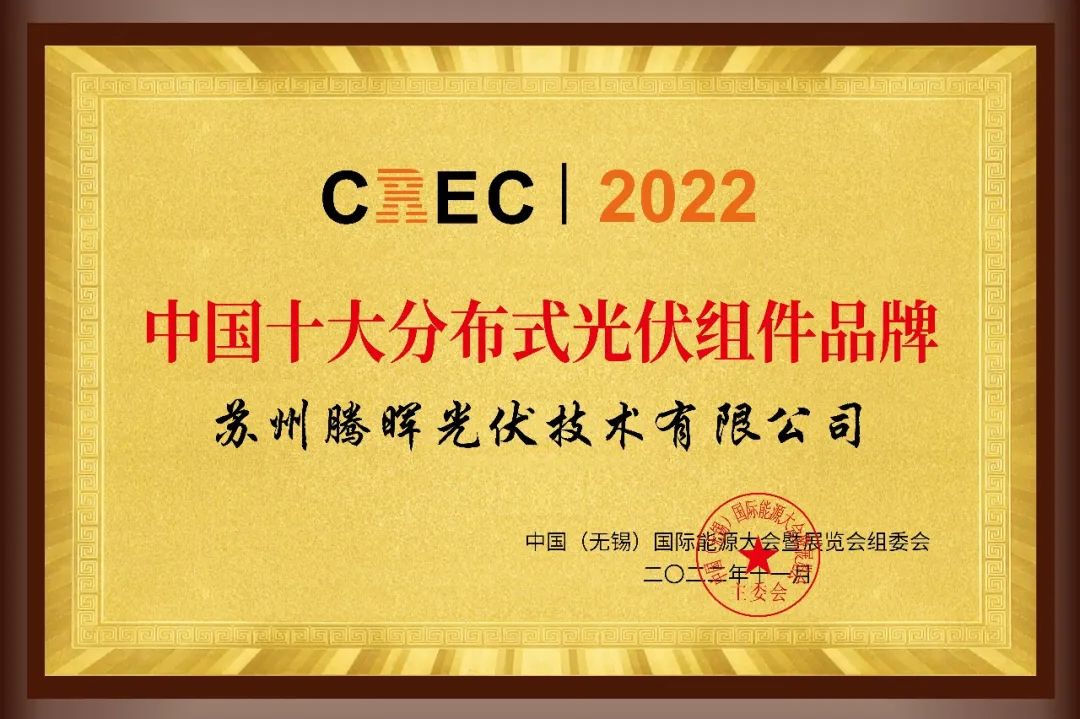 同期,由中國(無錫)國際新能源大會暨展覽會(CREC)組委會舉辦的“中國十大分布式光伏品牌評選”活動在頒獎典禮現(xiàn)場正式公布獲獎企業(yè)榜單,騰暉光伏再次榜上有名,至此,騰暉光伏已數(shù)次榮獲“中國十大分布式光伏組件品牌”稱號。