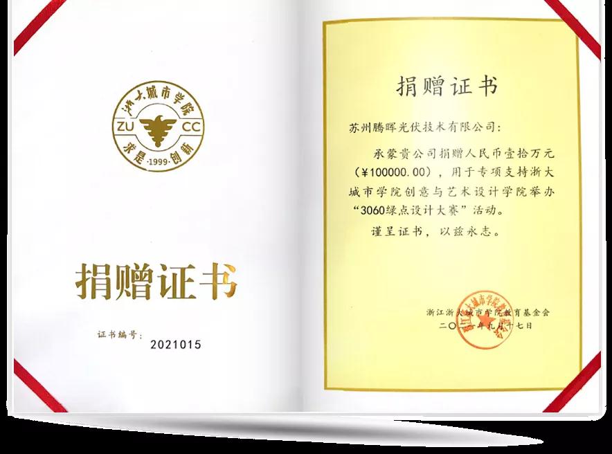近日,騰暉光伏向浙大城市學院捐資十萬元,專項支持該校3060綠點設計創(chuàng)新大賽活動。此外,雙方還將在清潔能源推廣與應用、創(chuàng)新人才培養(yǎng)和能源科技成果轉(zhuǎn)化等多個領域深化合作關系。