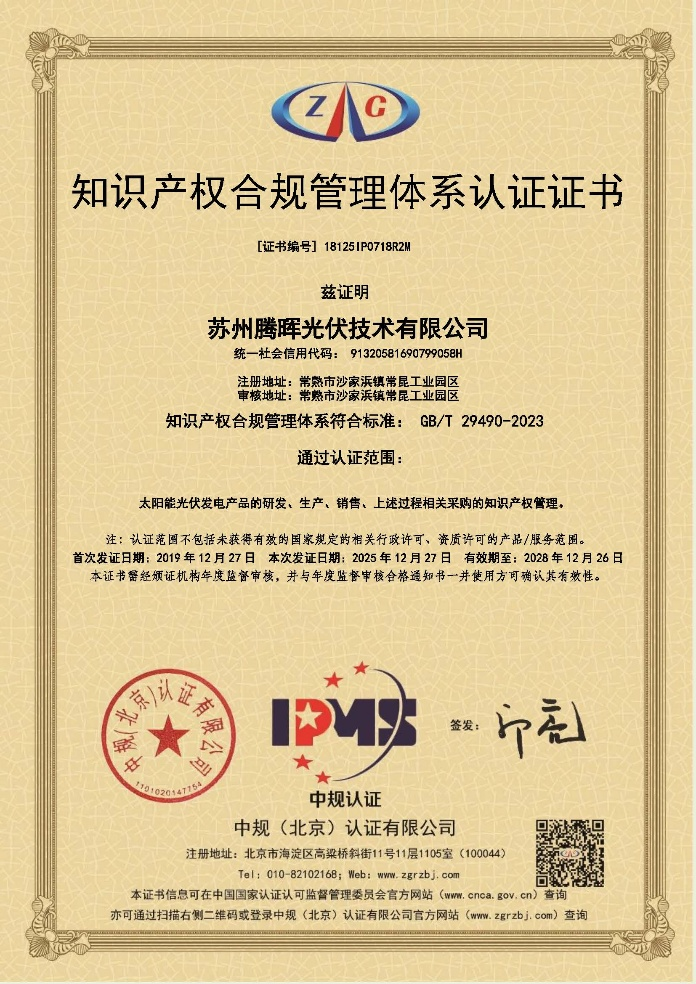 蘇州騰暉光伏始終將知識產(chǎn)權(quán)視為企業(yè)可持續(xù)發(fā)展的戰(zhàn)略資源和創(chuàng)新驅(qū)動發(fā)展的核心要素。本次順利通過再認證換版審核,不僅標志著公司知識產(chǎn)權(quán)管理體系符合最新國家標準要求,更體現(xiàn)了公司在知識產(chǎn)權(quán)領(lǐng)域精細化、規(guī)范化管理能力的持續(xù)鞏固與提升。
