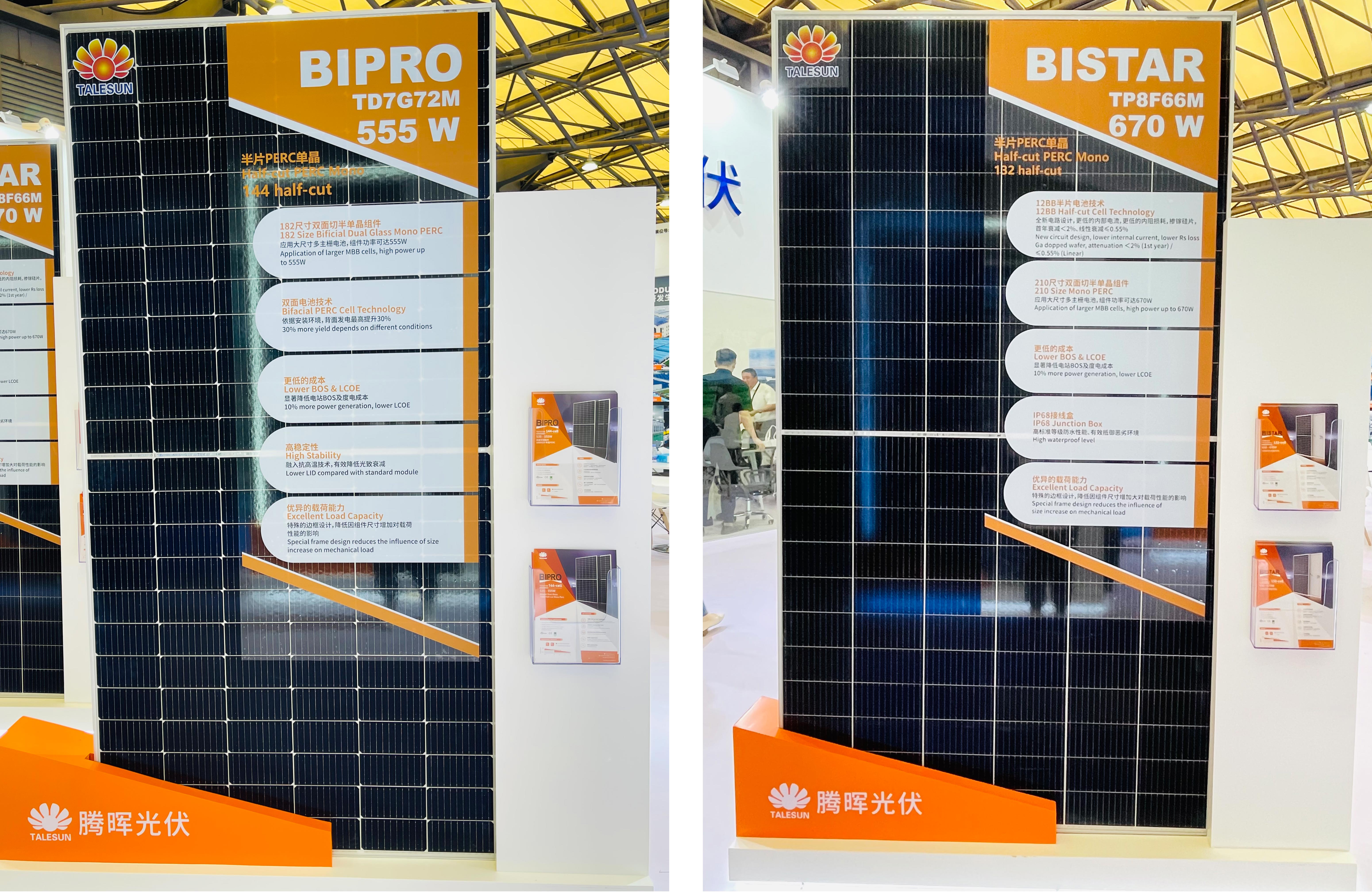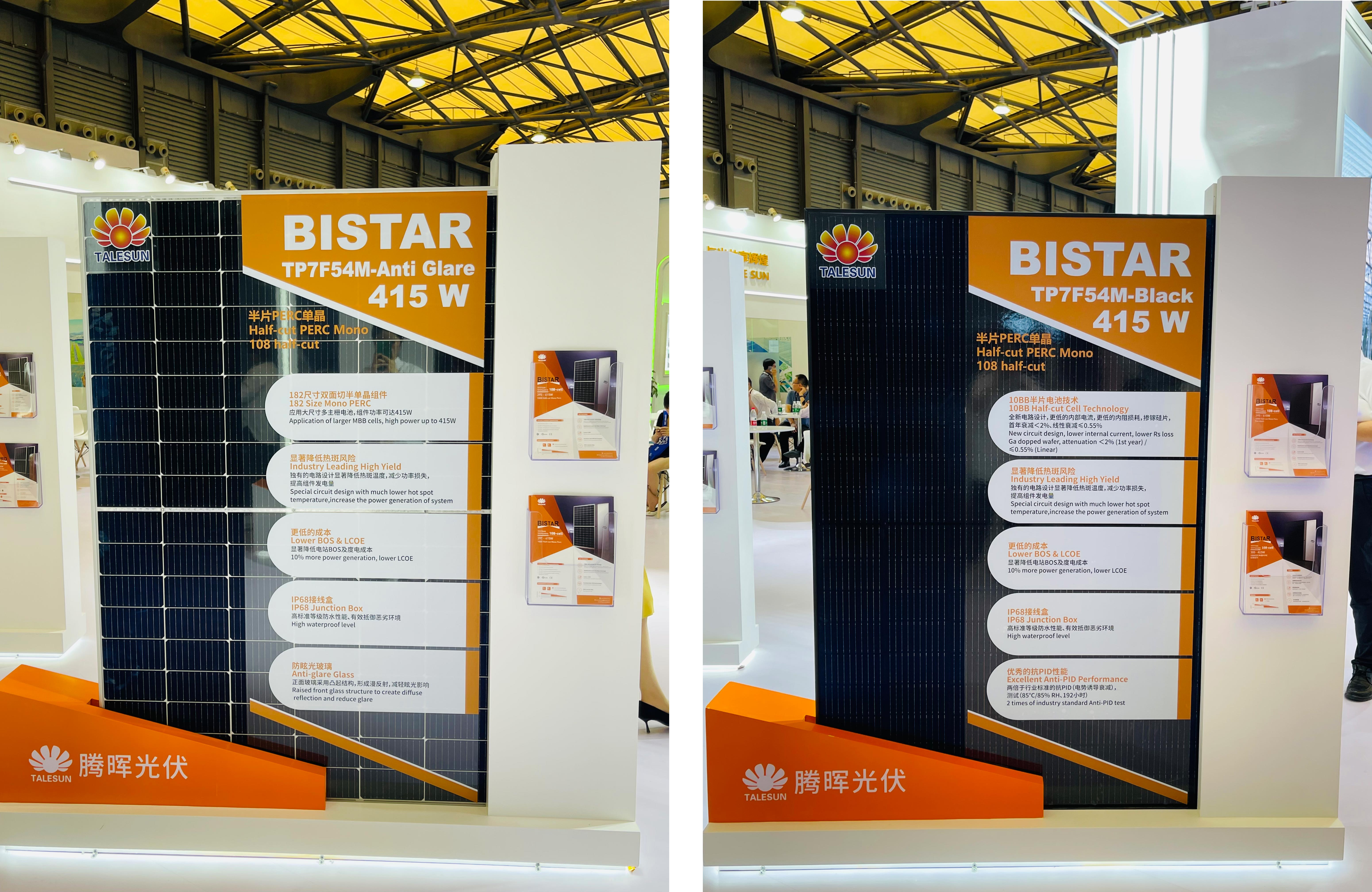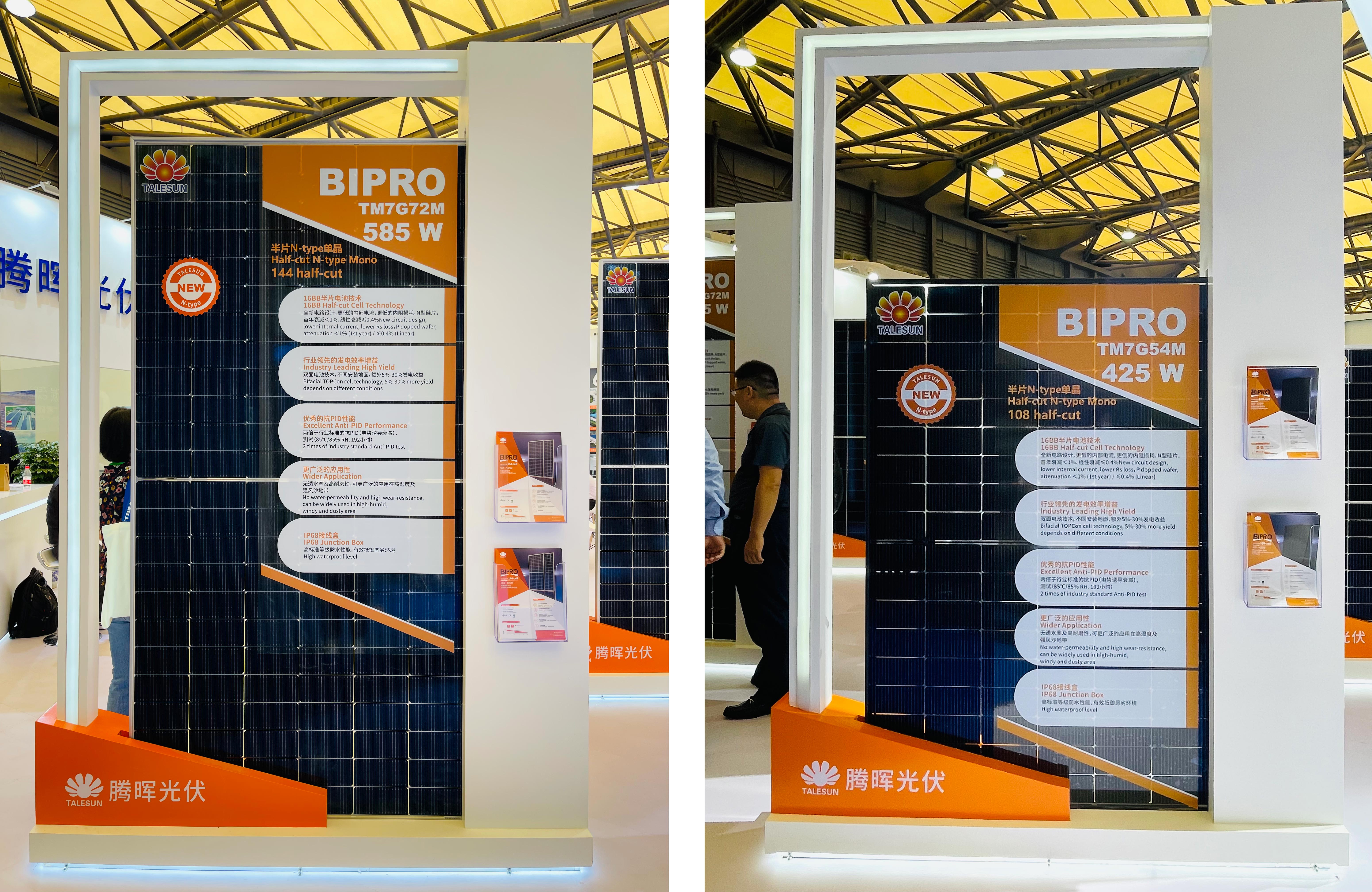 位于 E1-530 展臺的騰暉光伏,首次攜 N 型組件在國內(nèi)亮相,正式宣布進(jìn)入“N”時(shí)代。此次展出兩款組件分別為:BIPRO_TM7G72M 及 BIPRO_TM7G54M。由于 N 型組件更低的溫度系數(shù)、更高的雙面率、更低光致衰減等方面的發(fā)電性能優(yōu)勢,比起常規(guī) P 型組件來說在相同直流側(cè)容量下帶來至少 3%的發(fā)電量增益。同時(shí),N 型組件由于更高的轉(zhuǎn)換效率,相應(yīng)降低了所吸收光能的熱轉(zhuǎn)換,從而降低了組件的工作溫度。因此,在提升發(fā)電量的同時(shí),發(fā)電回報(bào)更高、應(yīng)用環(huán)境更廣、更受客戶青睞。